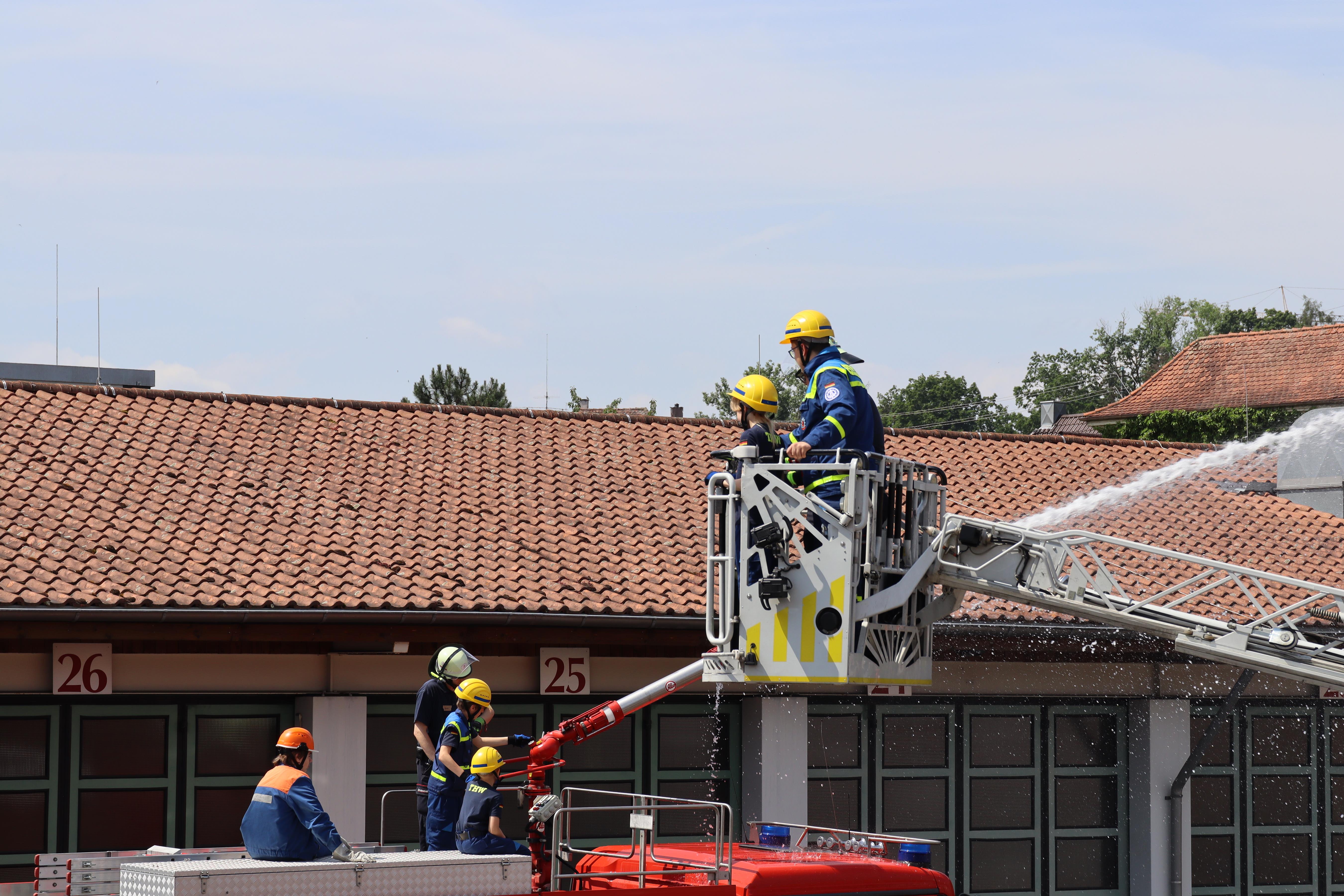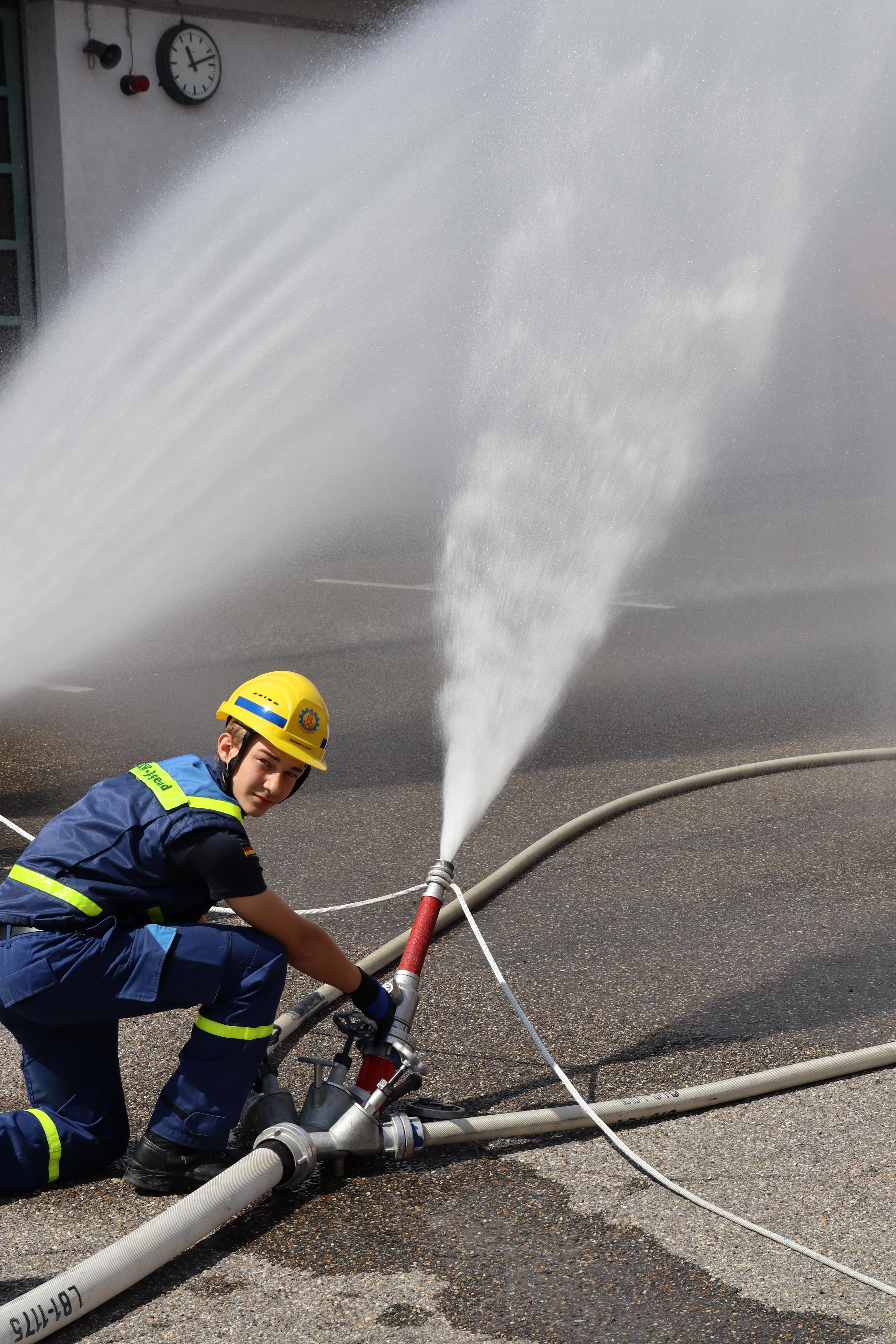 Bei tollem Wetter bereiteten der Aufbau eines Löschangriffs und der Betrieb des Dachwerfers eines Tanklöschfahrzeuges (TLF) keine Probleme. Nur ein bisschen nass wurden die jungen Helferinnen und Helfer.