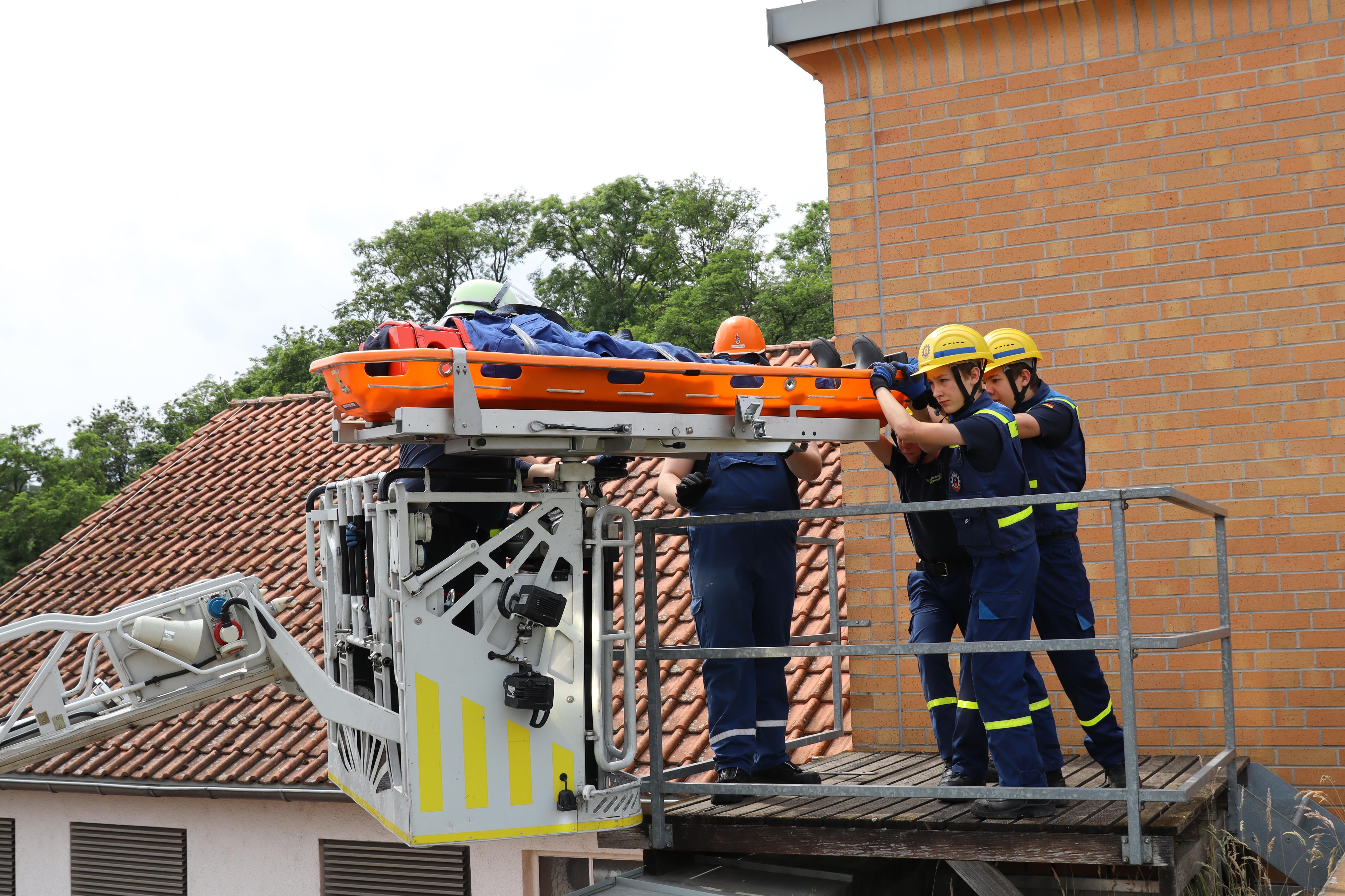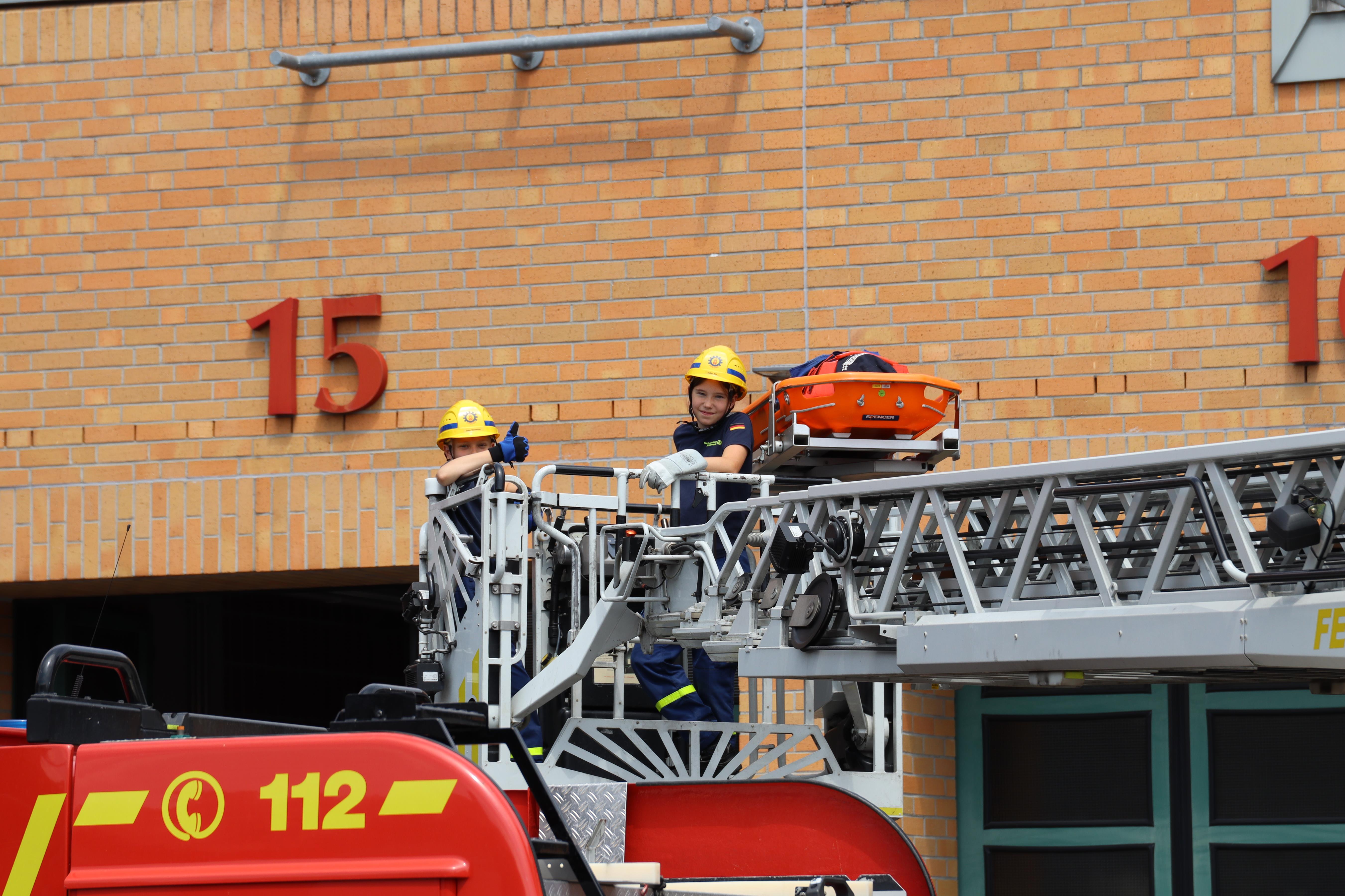 Hoch hinaus ging es anschließend mit der Drehleiter - natürlich für die bessere Aussicht, sondern zum Retten einer verletzten Person aus dem Obergeschoss der Feuerwache. Wie das funktioniert, wenn mal keine Drehleiter zur Verfügung steht, konnte danach beim sogenannten Leiterhebel ausgiebig geübt werden.