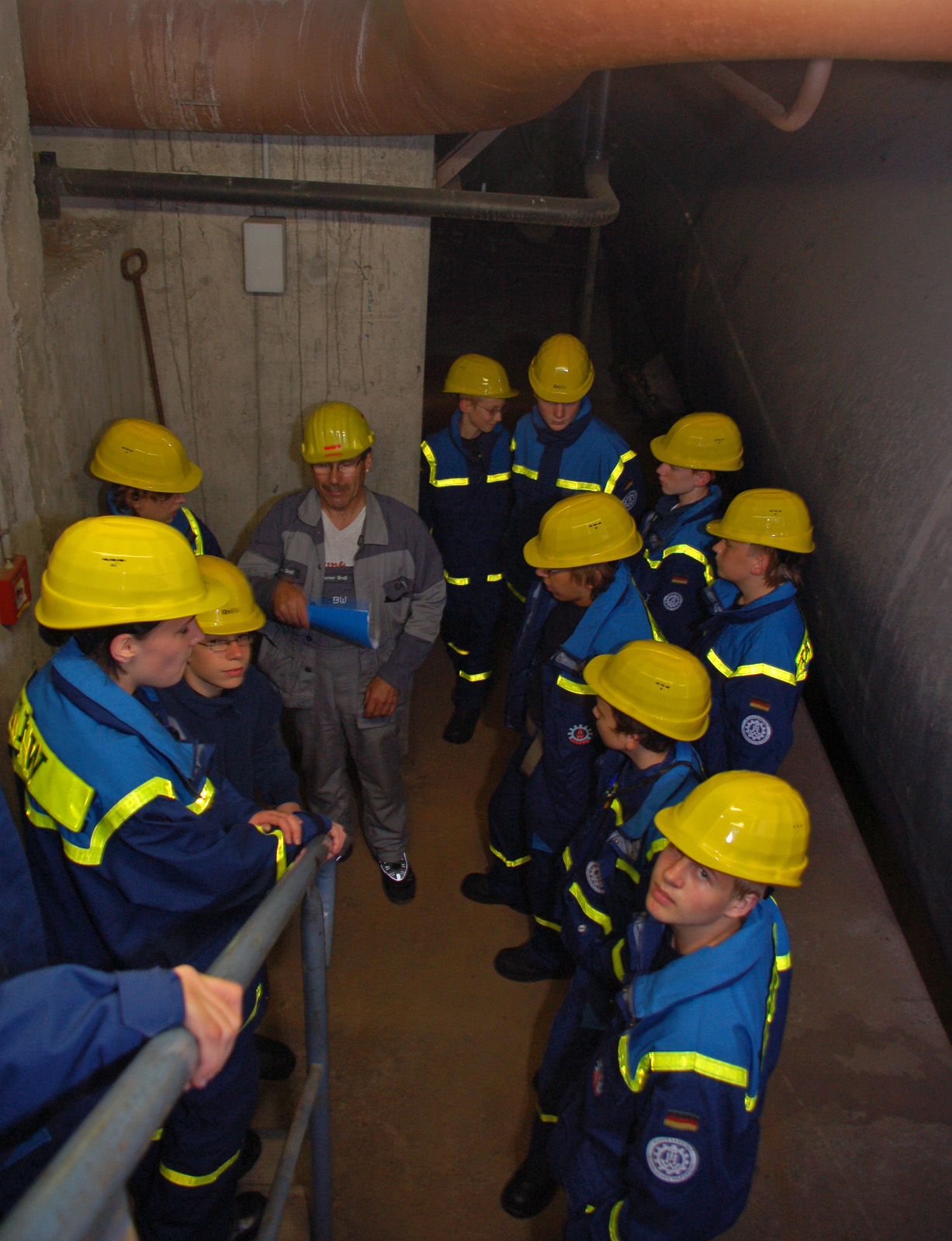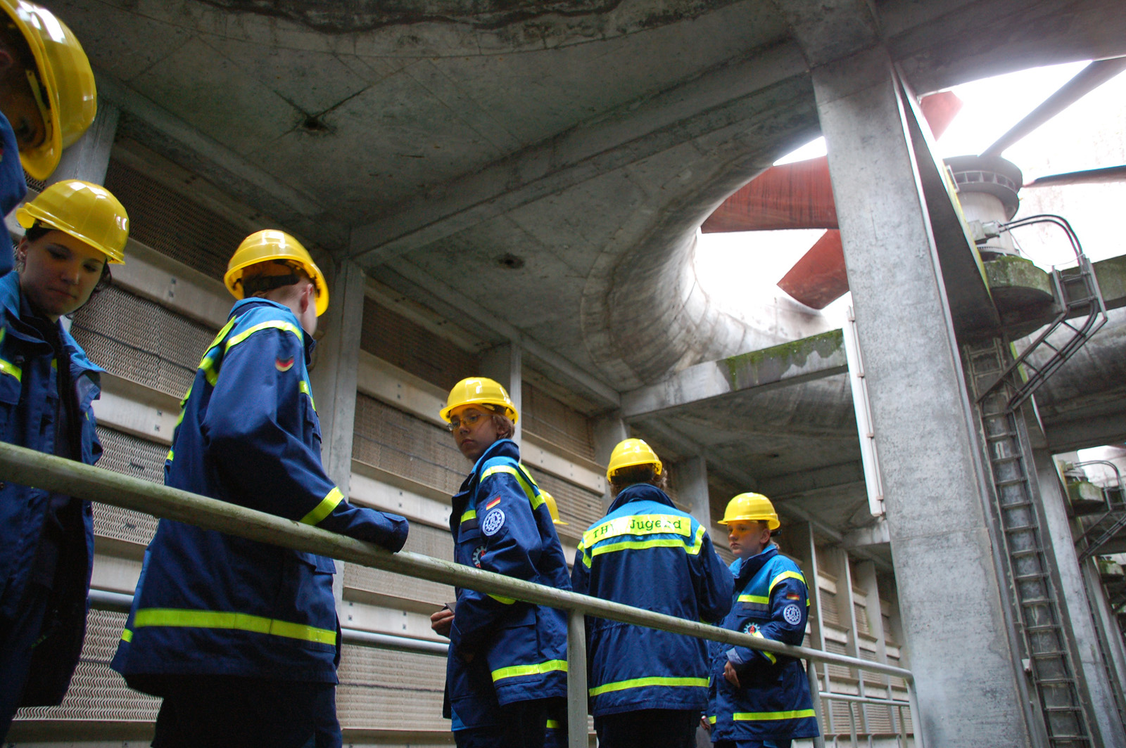 Danach arbeitete sich die Gruppe den Turm abwärts, vorbei an den noch warmen Heizspiralen, bis hin zu der im Turm befindlichen Gasturbine. Von dort aus ging die Tour Richtung Kühltechnik, man durfte neben den Pumpen und der 2,5 Meter hohen Kühlwasserleitung, auch den mit riesigen Ventilatoren ausgestatten Kühlturm begutachten. Nach dieser, für viele wirklich beeindruckende Erfahrung, lief man wieder zurück ins Kraftwerk, unter den enormen Gasleitungen für den Dampfgenerator hindurch, zum eigentlichen Stromgenerator. Dort bot sich den Junghelfern die Möglichkeit, diese Maschine zu betreten und einen wahren Einblick zu erlangen. In der Kommandozentrale des Kraftwerks erfuhr man dann wo, wie und von wem das Kraftwerk gesteuert wird – was einigen Helfern nahezu unmöglich erschien, beim Anblick der unzähligen Bildschirme.