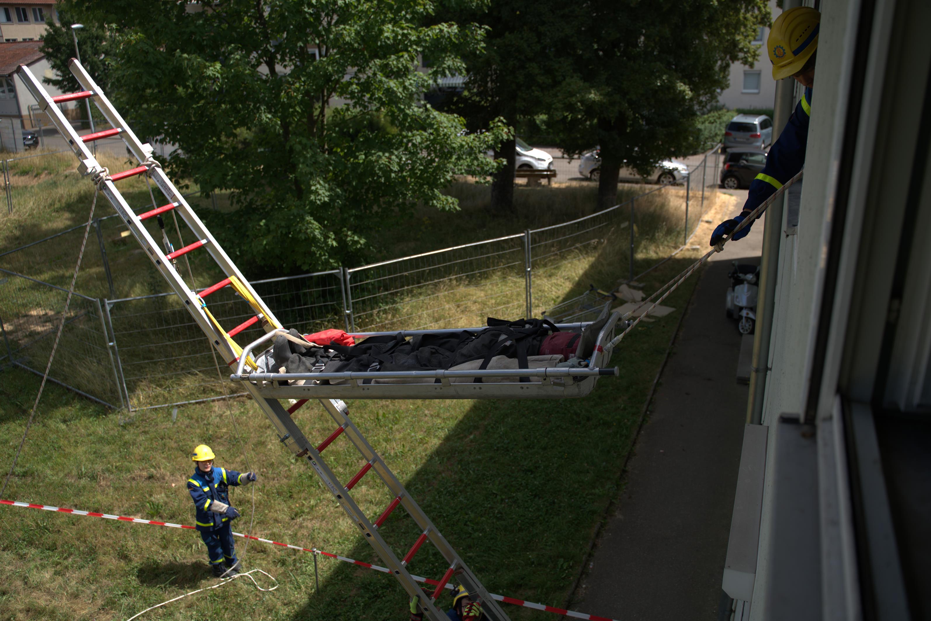 Nachdem Personen gefunden wurden, mussten diese aus Trümmern befreit, erste Hilfe geleistet werden und im Anschluss mit verschiedenen Rettungstechniken aus dem Gebäude gebracht werden. Dies gelang beispielsweise über eine errichtete schiefe Ebene, bei der die verletzte Personen mit einem Schleifkorb aus dem Gefahrenbereich transportiert werden konnten. Aus erhöhter Lage konnten diese mithilfe eines Leiterhebels schonend abgelassen und im Anschluss dem Rettungsdienst übergeben.